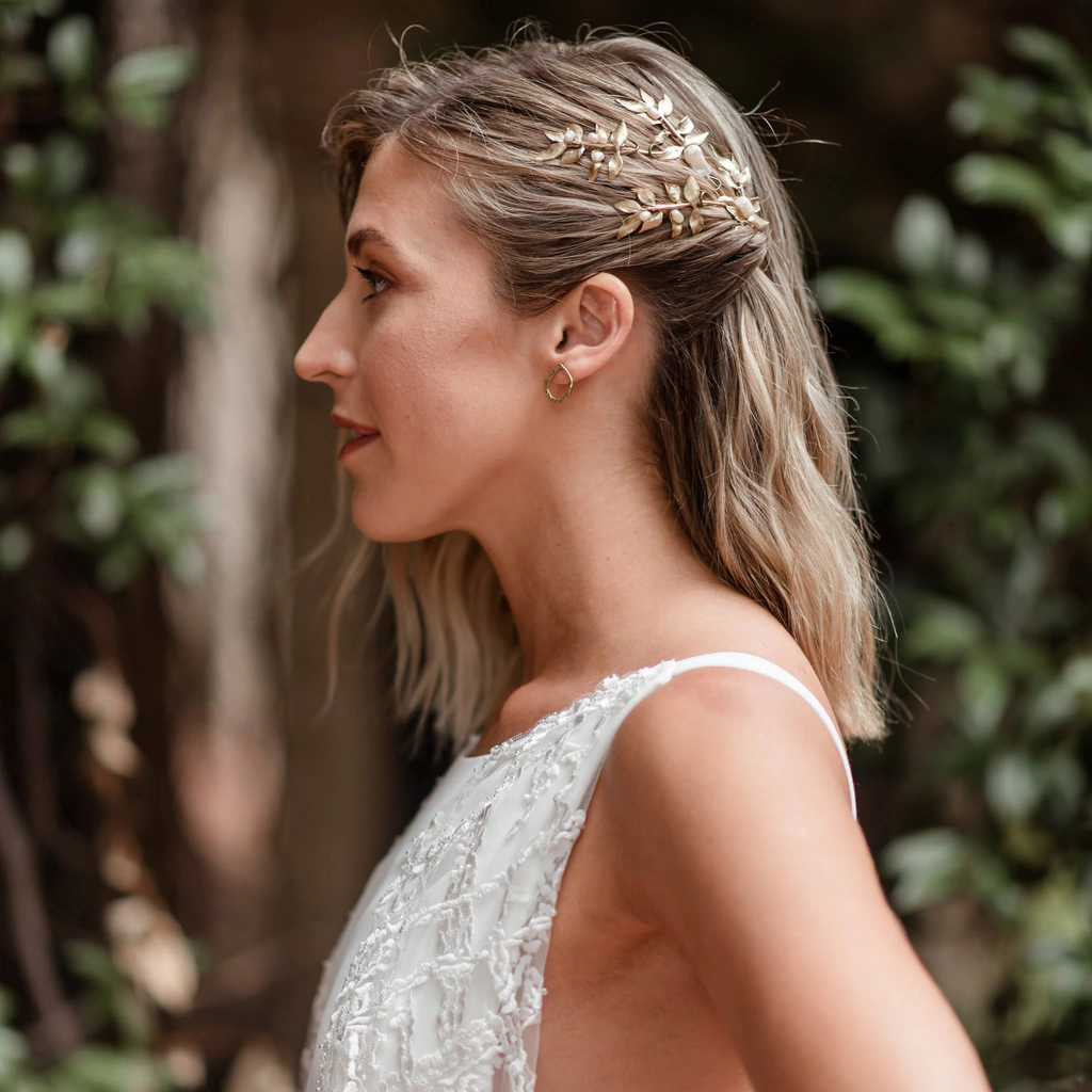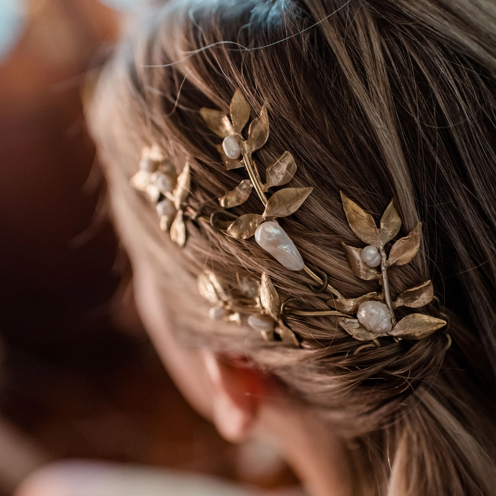 Tocado de orgánicos fundidos en bronce con aplicación de perlas .