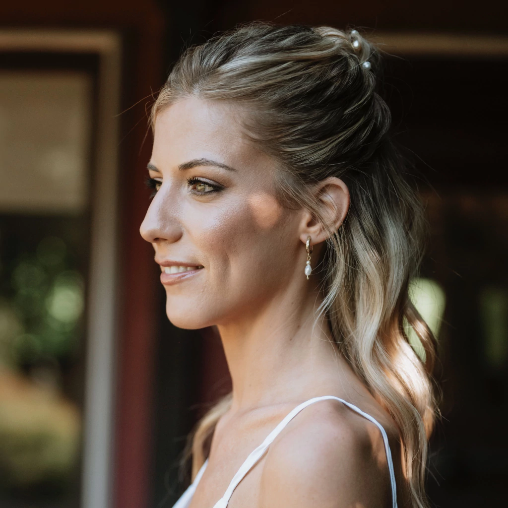 Pulsera fundida en bronce y aros de bronce con perla de rio.