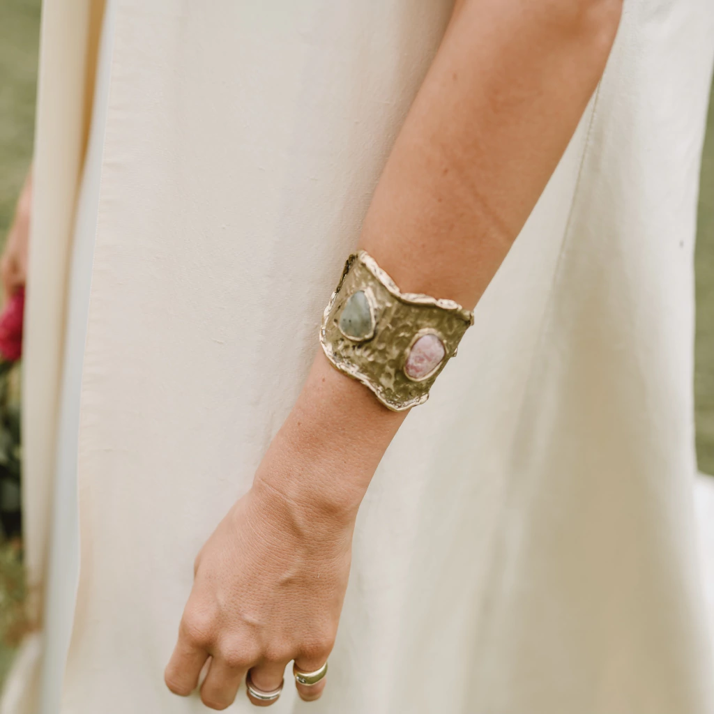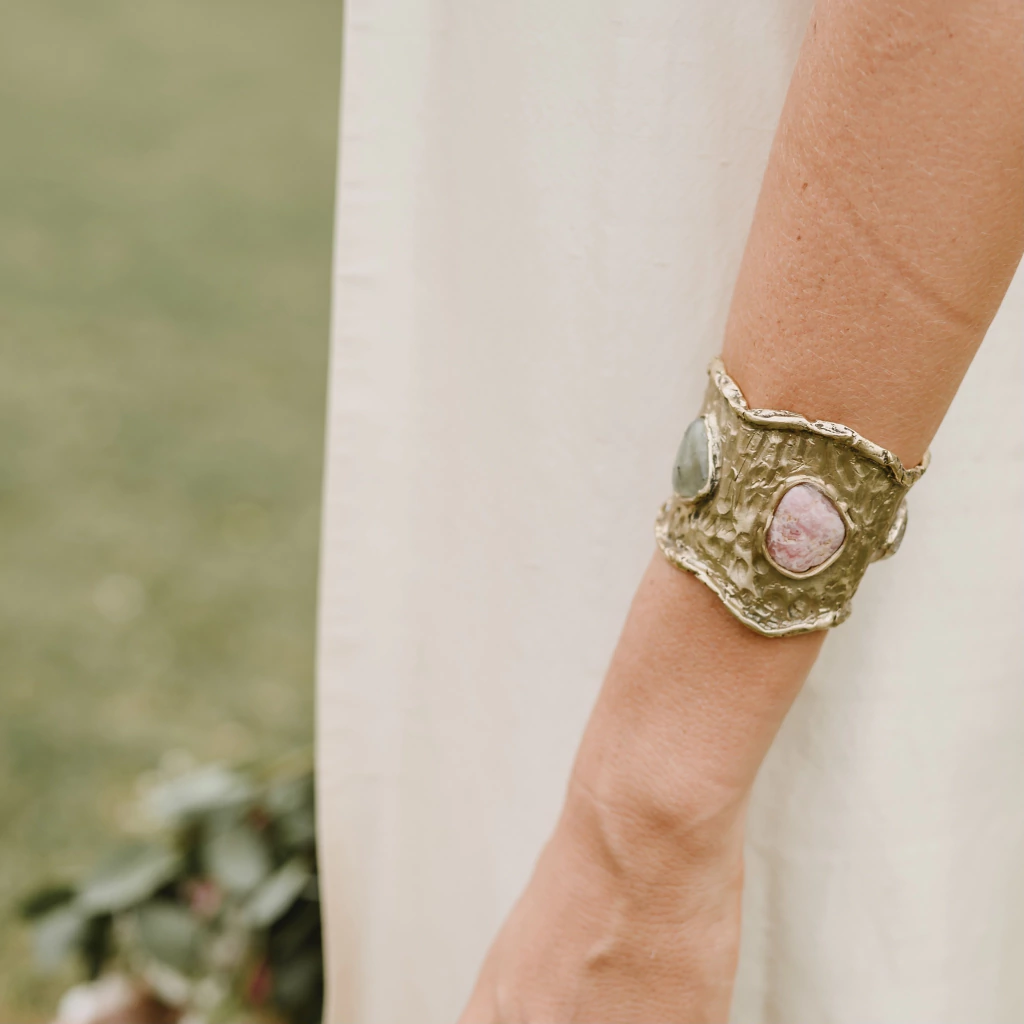 Pulsera de bronce con piedras únicas trabajadas a mano.