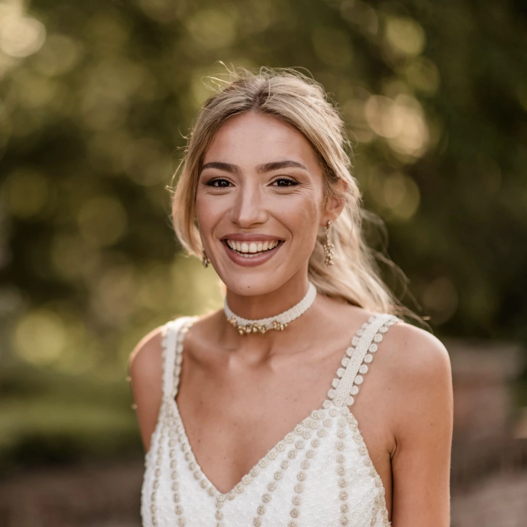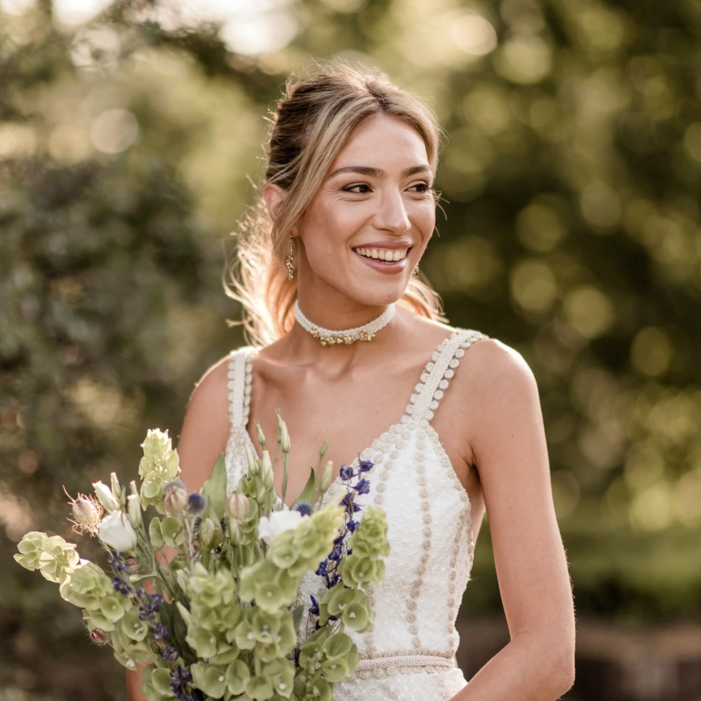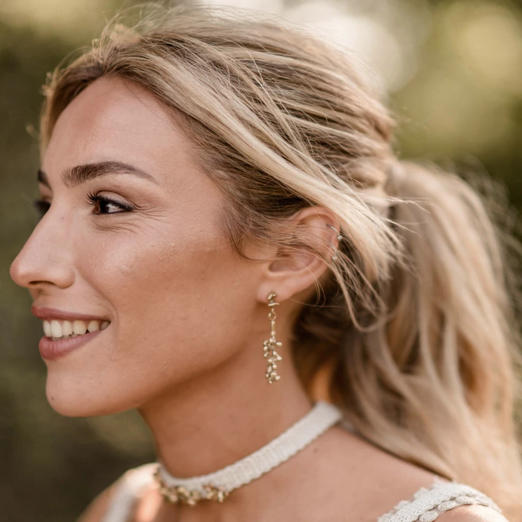 Chocker con un retazo de tela de su vestido y un aplique de bronce fundido por encima. Lo combinó con nuestros Aros Fruto