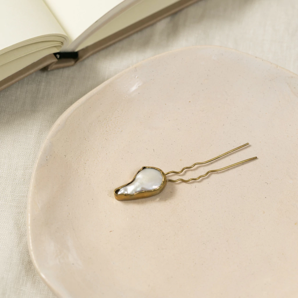 Pin trabajado a mano con engarce de perlas de río o piedra nácar.