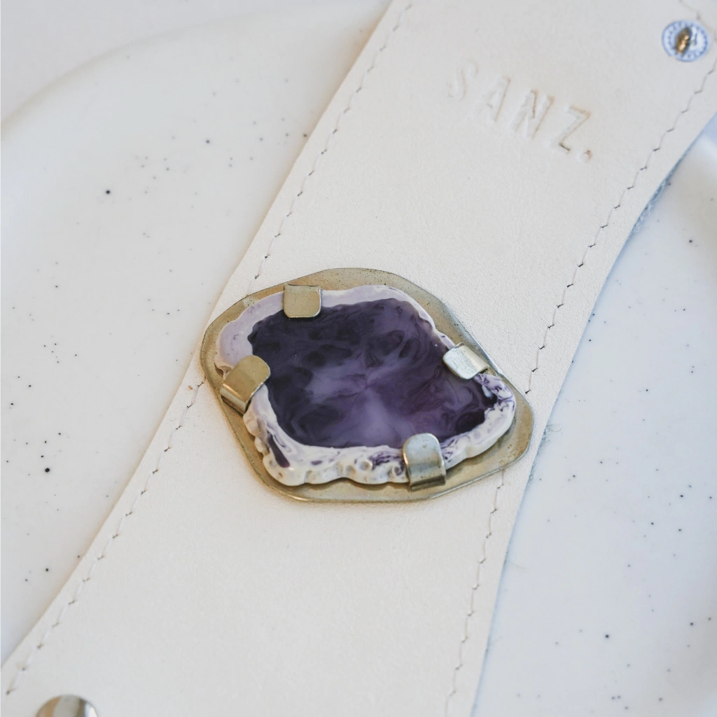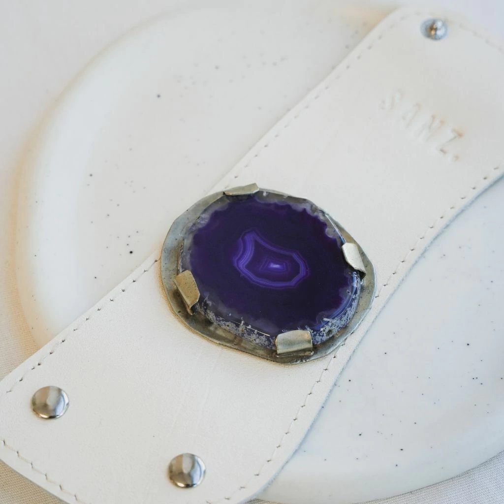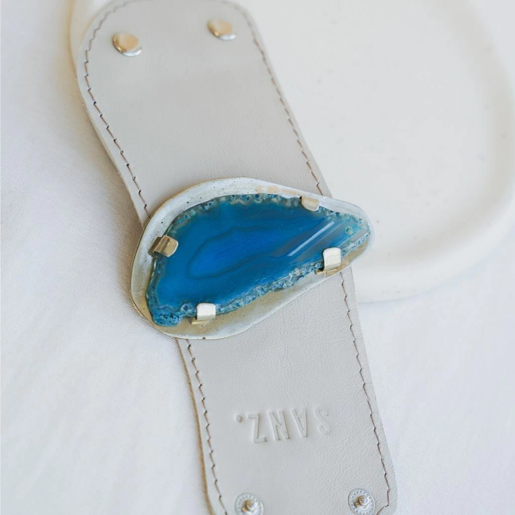 Pieza única de cuero con piedra Agatha sobre base de metal.