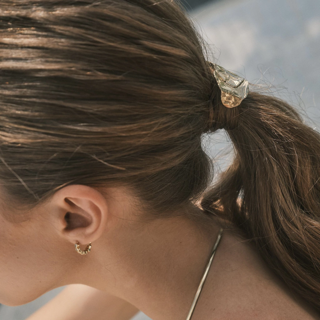 Tapagomitas con piezas fundidas en bronce trabajadas a mano. Incluye gomita de pelo.