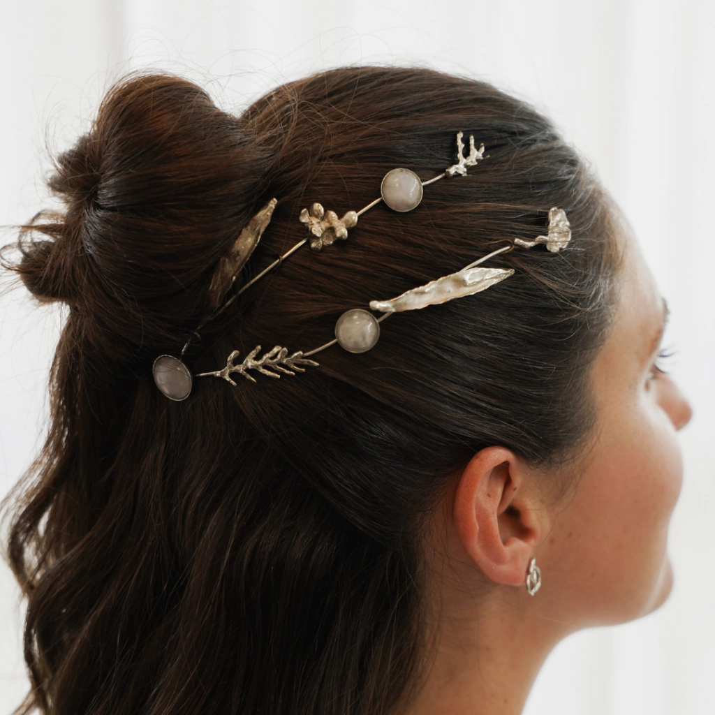 Tocado trabajado a mano con orgánicos fundidos y tres piedras onix.