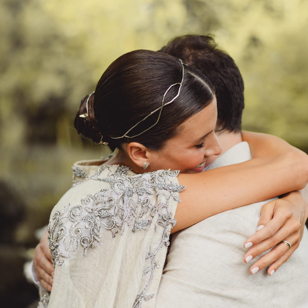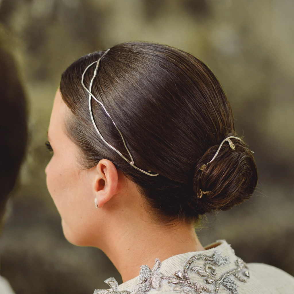 Vincha y cubre rodete con hojitas fundidas en alpaca. Aros Hoja en plata