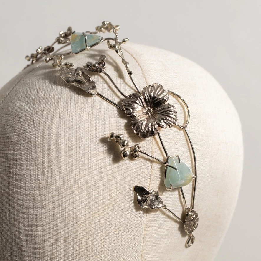 Vincha trabajada a mano con variedad de flores y hojas fundidas y piedras únicas engarzadas.