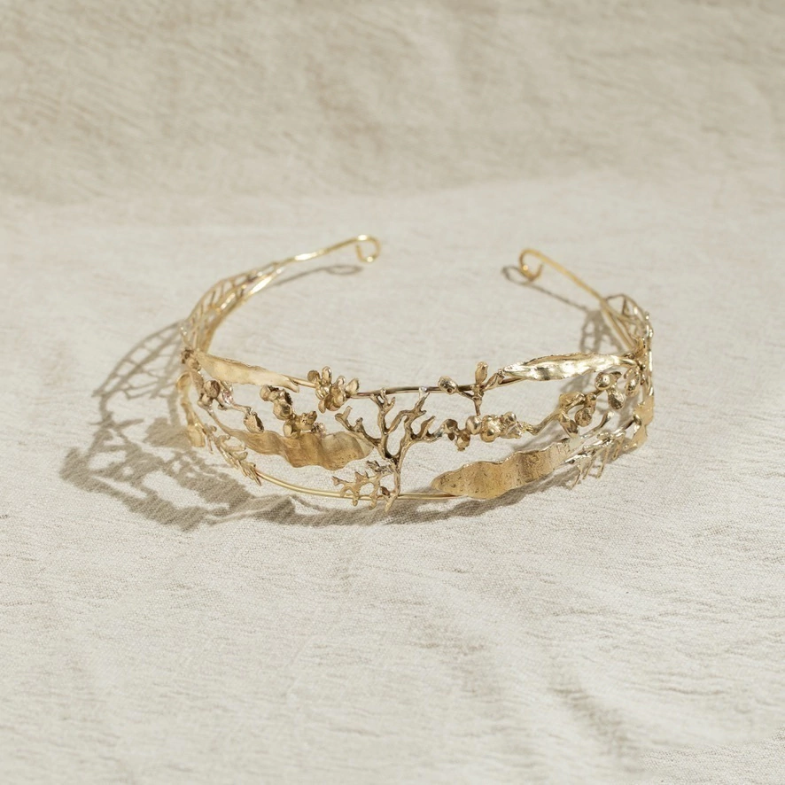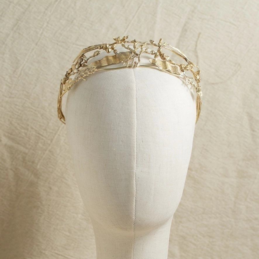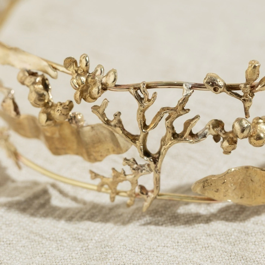Corona trabajada a mano con flores y hojas orgánicas fundidas en bronce.