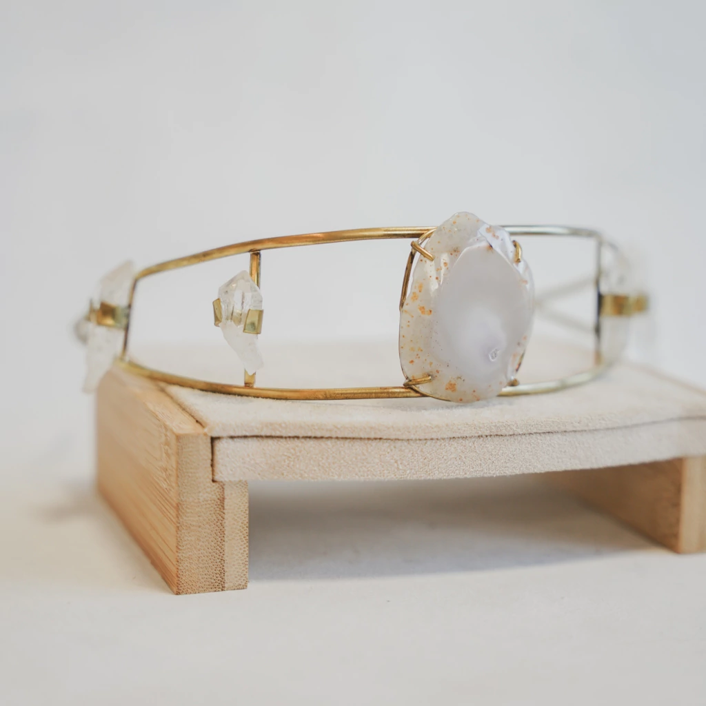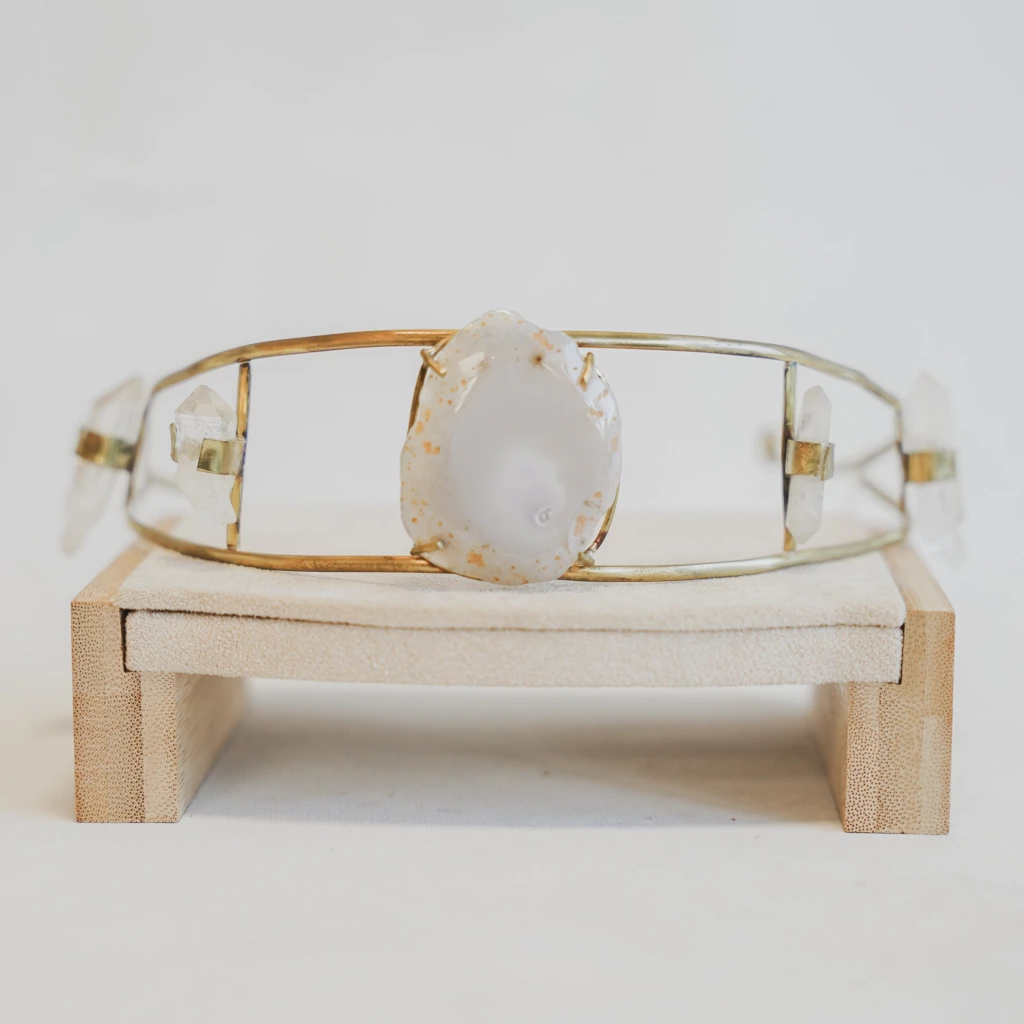 Vincha trabajada a mano con piedras agatha y cuarzos cristal, pieza única.